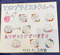 施設長からお礼の言葉と先月のボーリングの子供さん達からのお礼の色紙を頂きました。